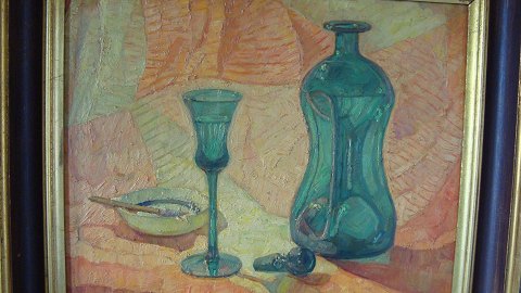Einar Parslev (1891-1977): Opstilling med grøn klukflaske og snapseglas mm 1950. Olie på plade. Sign.: Einar Parslev 1950. Begpå betegnet "Glasflaske og glas". 30x38 (39x47)