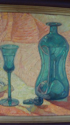 Opstilling med grøn klukflaske og snapseglas mm 1950.