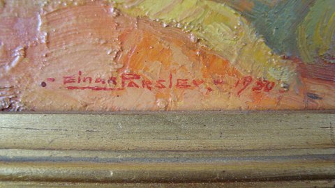 Einar Parslev (1891-1977): Opstilling med grøn klukflaske og snapseglas mm 1950. Olie på plade. Sign.: Einar Parslev 1950. Begpå betegnet "Glasflaske og glas". 30x38 (39x47)