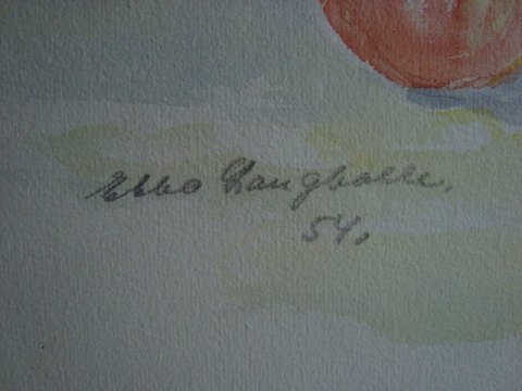 Ebba Langballe (20 årh): Opstilling med kande, frugt og græskar 1954. Akvarel på papir. Sign.: Ebba Langballe 54. 52x40 (55x43)