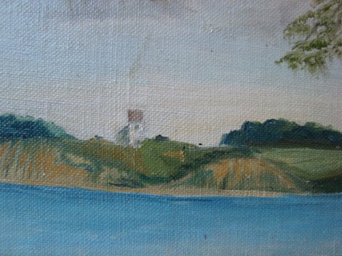 Landskab med sø og landsby med kirke 1928.