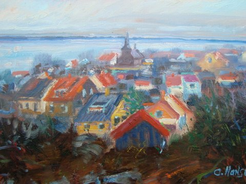 Alex Hansen (født 1947): Vue ud over by. Olie på lærred. Indrammet i lækker guldramme. Sign.: A. Hansen. 40x50 (52x62)