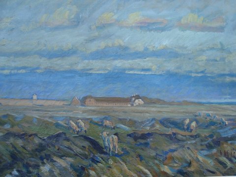 Jakob Hübschmann (1894-1974): Marsklandskan med marskgård og græssende får samt by i baggrunden med kirke. Olie på lærred - nyrenset. Sign.: J. Hübschm. Indrammet i Varde. 46x74 (54x81)