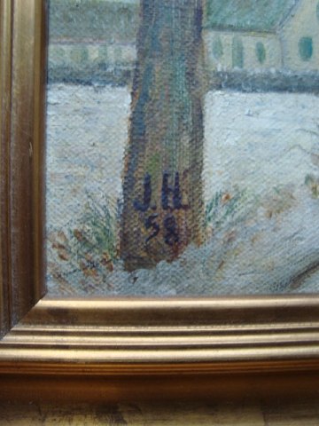 Jo Hahn Locher (1876-1960): Vinterparti med allé op til ejendom 1958. Olie på lærred. Sign.: J.HL. 58. 22x31 (32x41)