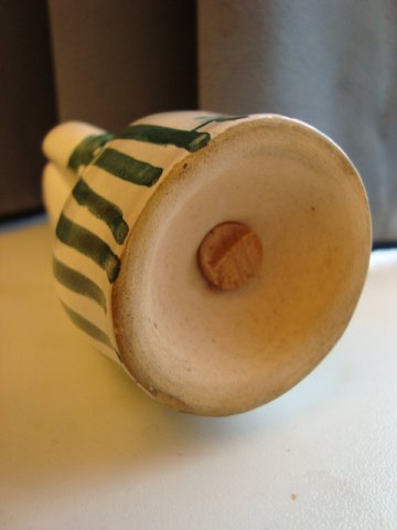 Kvindefigur i form af peberbøsse (pebermø). Glaseret lertøj med forskelligfarvet dekoration. Usigneret. Højde - 13 cm