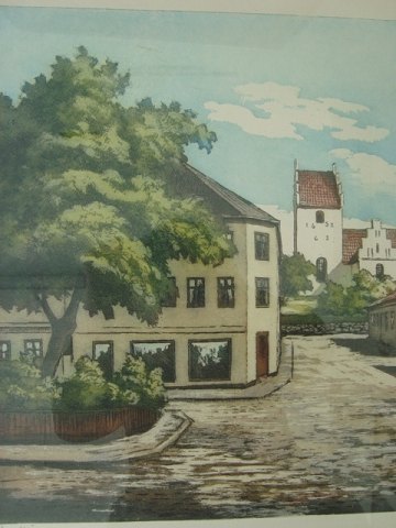 Peder Møller (1890-1961): Parti fra Nørresundby med kirken i baggrunden. Farveradering på papir. Betegnet - Nørre Sundby Sign.: Peder Møller 51x59 (58x67)
