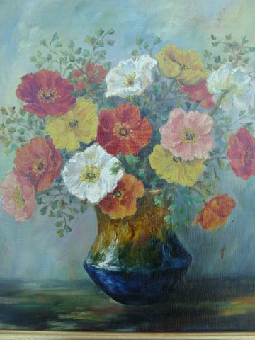 Ubekendt kunstner (19/20 årh): Valmuer i blå vase på bord. Olie på lærred. Indrammet i nyere guldramme. Sign.: JB (Èn for mig ubekendt signatur - kan nogen hjælpe?). 32x37 (41x45)