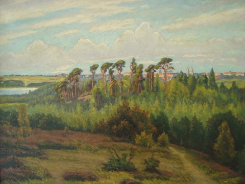 Landskab ved Viborg med vue ind over byen, søerne og domkirken.