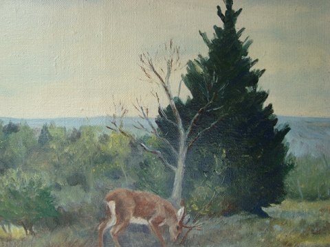 G. Jans (20 årh): Spisende råvildt ved bevoksning. Olie på lærred. Nyrenset. Sign.: G. Jans Messingskilt - G. Jans. Indrammet i meget smuk ældre ramme. 32x44 (48x60)