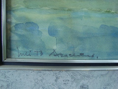 Ubekendt kunstner (20 årh): Parti fra egnen ved Aggersund 1973. Akvarel på papir. Indrammet i smuk sølvramme. Betegnet - Aggersund juli 73. 30x40 (32x42)