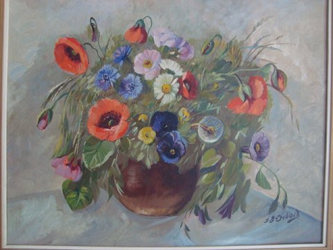 Ingeborg Bentine Debois (1897-1970): Krukke med kornblomster, valmuer, stedmoderblomster m.fl. Olie på lærred. Sign..: I.B. Debois Bagpå - No. 1837 40x50 (47x57)