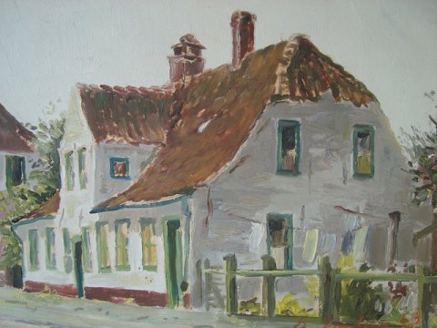 Ubekendt kunstner (20 årh): Gadepart med huse 1963. Utydelig signeret - kan nogen hjælpe? Olie på plade. 37x51 (50x64)