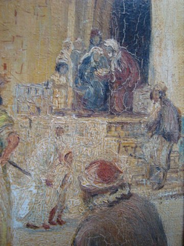 Ubekendt kunstner (20 årh): Folkemængde i Jerusalem. Olie på lærred. Utydelig sign.: Cryri.. Zerok....??? Krakeleret. Betegnet på bagsiden - Jerusalem 45x35 (56x46)