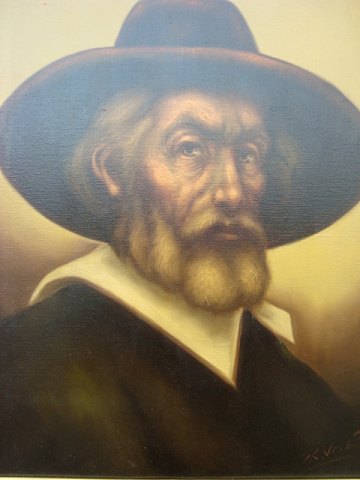 Ubekendt kunstner (20 årh): Portræt af ældre, puritansk mand med hat. Olie på lærred. Sikkert en pastiche efter gammelt kunstværk. Sign.: R. Verb........? Messingskilt - Verbrykken 40x50 (60x50)