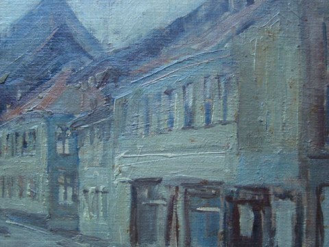 Ole Sværdpiil (1914-80): Byparti med biler og personer - antagelig Aarhus. Olie på plade. Sign.: Ole Sværdpiil. 34x50 (38x54)