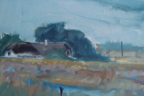 Knud Bøstrup (1927-2011): Klitparti med grantræer og gård i baggrunden. Olie på lærred. Sign.: K. Bøstrup 25x30 (34x39)