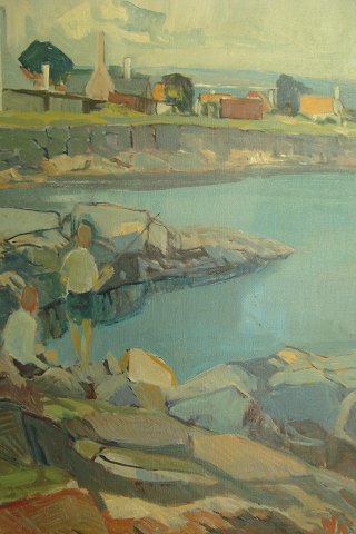 Nis Stougaard (1906-87): Kystparti fra Bornholm med fiskende børn og røgerier. Olie på lærred. Sign.: Nis Stougaard Messingplade - N. Stougaard. 50x40 (60x50)