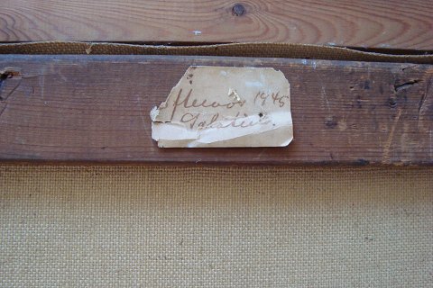 Bagpå blindramme - udstillingsmærkat "Efteraar 1945 - Galatius".