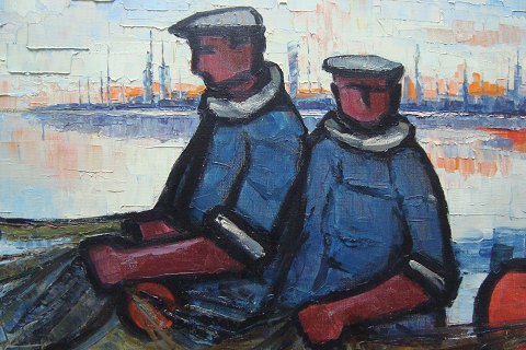 Roald Hansen (1938-2018): Fiskere røgter garn. Olie på lærred. Sign.: Roald Hansen Et maleri stærkt inspireret af Anker Landberg. Indrammet i sølv svæve ramme. 42x84 (46x88)