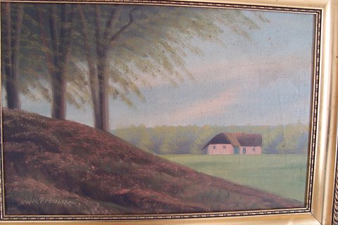 Ubekendt kunstner (20 årh): Bondehus ved skov. Olie på lærred. Sign.: Hartmann 30x45 (40x55)