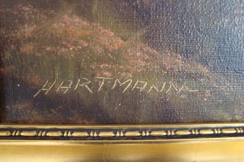 Ubekendt kunstner (20 årh): Bondehus ved skov. Olie på lærred. Sign.: Hartmann 30x45 (40x55)