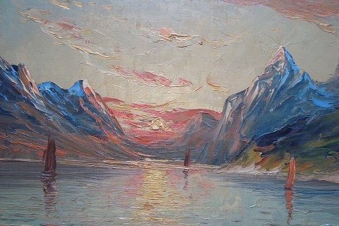 Gustav P. Rimmer (1904-88): Fjordparti med skibe og bjerge - solnedgang - antagelig Norge. Olie på lærred. Sign.: G.P. Rimmer. 32x47 (41x56)