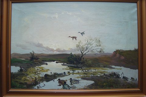 Flyvende ænder over mose.