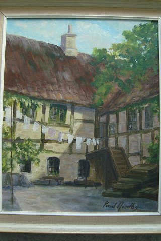 Paul Nordby (20 årh): Gårdeksteriør. Olie på lærred. Sign.: Paul Nordby 51x41 (60x50)