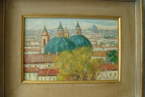 Armando Busa (1914-75): Udsigt udover kupler og tage i italiensk by. olie på plade. Sign.: A. Busa 24x35 (38x49)