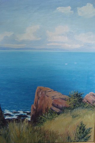 Egon Johannes Wilhjelm (født 1925): Kystparti med klipper, Bornholm 1955. Olie på lærred. Sign.: E. Johs. Wilhjelm 1955. 70x100 (79x109)