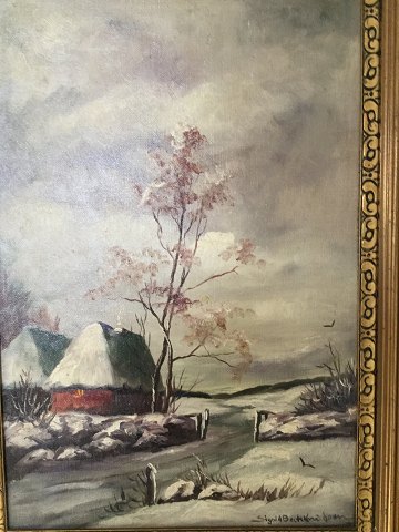Sigrid Bech-Knudsen (1864-1948): Vinterparti med huse ved vej. Olie på lærred. Sign.: Sigrid Bech Knudsen. 44x30 (55x42)