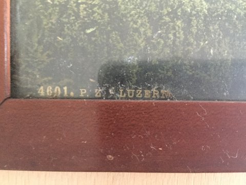 Koloreret foto/tryk. Starten fa den 20 århundrede. Indrammet i mahogni ramme hos H. Bentzon i Ribe. Vue ud over Luzern, Schweiz. Betegnet - 4601 P.Z. Luzern. Indrammet måler billedet - 22x53.