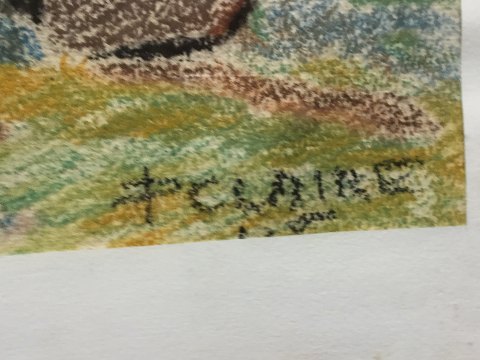 Auguste Jean Claire (1881-1970): Landskab med kvinde der malker ko 1945. Oliekridt på papir. Sign.: AJ Claire - 45. Fransk kunstner. Indrammet med lidt nusset passepartout. 39x49 (45x55)