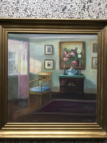 Ingeborg Benthine Debois (1897-1970): Interiør fra stue med empiremøbler. Olie på lærred. Sign.: I.B. Debois 49x49 (61x61)
