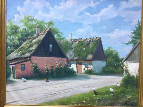 Osvald Karms (1885-1972): Landsbygade med stokroser og høns. Olie på lærred. Sign.: O. Karms 54x65 (68x79)