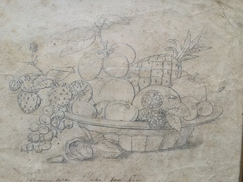 Andreas Fiebig (19 årh): Skål med frugter og nødder 1856. Bly på papir. Under tegning er der skrevet med pen - "Til min kjære Onkel - Juuleaften 1856 - Fra din Andreas Fiebig" 16x19 (18x21)