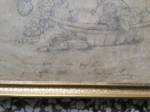 Andreas Fiebig (19 årh): Skål med frugter og nødder 1856. Bly på papir. Under tegning er der skrevet med pen - "Til min kjære Onkel - Juuleaften 1856 - Fra din Andreas Fiebig" 16x19 (18x21)