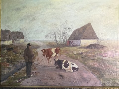 Mark Osman Curtis (1879-1959): Bondemand på vej hjem med kalve.. Olie på lærred. Sign.: Koefod-Hansen (Pseudonym). Nyrenset. Krakelleret. Betegnet - Hjem fra ........ 66x90 (86x110) 6117