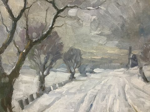 Jens Sinding Christensen (1888-1980): Vej med mølle og nøgne træer, vinter. Olie på lærred. Nyrenset Sign.: JSC (Monogram) 50x58 (61x70)