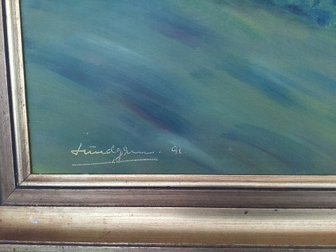Henry Lundgren (1923-2016): Landskab 1991. Olie på lærred. Sign.: Lundgren 91. Bagpå lærred - H. Lundgren, Syrenvej 6, Viborg 1991 35x50 (43x57)