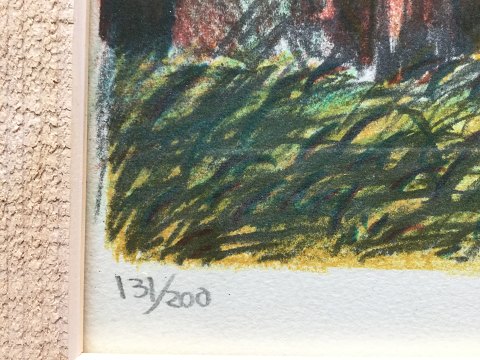Poul Sørensen (1931-2018): Fiskerhuse ved havet. Farvelitografi på papir. Sign.: Poul Sørensen (bly) Nummer 131/200 40x30 (32x38) Poul Sørensen er uddannet fra Teknisk Skole i Frederikshavn.