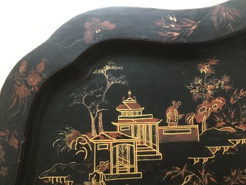 Antik lak bakke. Sort lak med guld og rødbrun dekoration. Barokform. Kina/Japan 19 årh. 47x61
