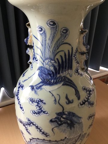 Kinesisk Porcelæn (19 årh): Svag celadon fond med blå og hvid dekoration. Dekoreret med påfugl og fuhund. 2 gennembrudte ører. Uden stempel. Højde - 44½ cm. Diameter i top og bund - ca. 18 cm.