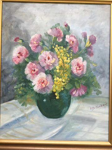 Krukke med lyserøde nelliker og mimoser.
