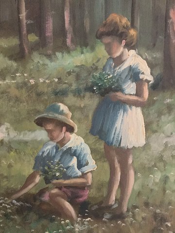 Arling Gade (1919-2011): Børn plukker blomster i skov Olie på lærred. Sign.: A. Gade 49x39 (58x48)