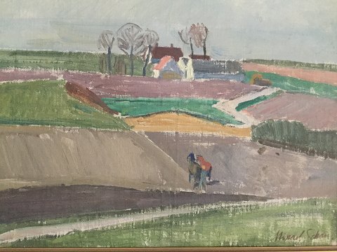 Mikael Schou (1912-86): Landskab med gård. Olie på lærred. Sign.: Mikael Schou 32x41 (40x49) 26019