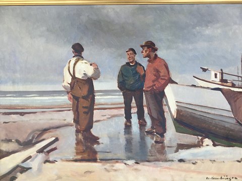 Christian Valentinussen (1903-85): Fiskere på stranden ved Vestkysten. Olie på lærred. Sign.: Chr. Valentinussen 70x96 (84x110)