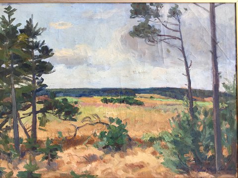 Søren Josva Christensen (1892-1948): Parti fra egnen ved Skørping. Olie på lærred. Sign.: Søren Josva Christensen Bagpå lærred betegnet 1054 Gl. B..... Skørping. Enkelte krakeleringer. 58x80 (71x94)