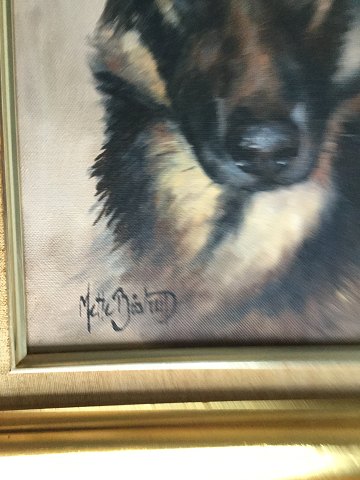 Mette Bøstrup (født 1961): Portræt af en Schæfer. Olie på lærred. Revne i lærred. Sign.: Mette Bøstrup 30x24 (46x40)