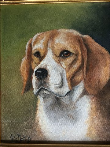 Mette Bøstrup (født 1961): Portræt af en hund. Olie på lærred. Sign.: Mette Bøstrup 30x24 (43x37)